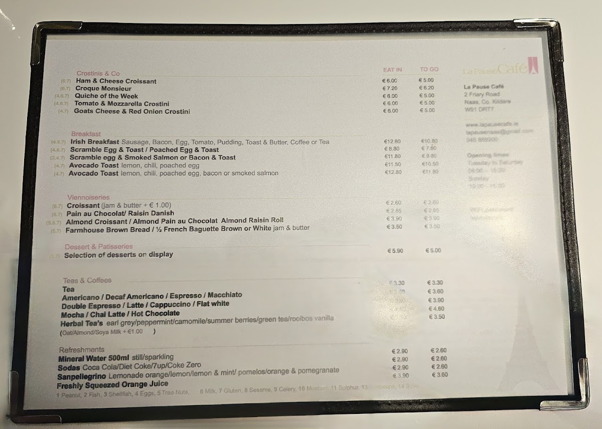 The menu at La Pause Cafe on Friary Rd in Naas East offers a thoughtful balance of indulgence and light fare, perfectly suited for a leisurely breakfast or afternoon treat. The standout Egg with Avocado Toast with Salmon exemplifies the café’s commitment to fresh, high-quality ingredients, with creamy avocado and delicately smoked salmon pairing beautifully atop perfectly poached eggs. For those with a sweet tooth, the Macaroons provide a delicate, melt-in-the-mouth finish, showcasing both classic flavors and seasonal variations. Every dish is complemented by expertly crafted beverages, with the Cappuccino standing out for its rich aroma and velvety texture, making it a highlight of the café experience. Overall, the menu reflects a careful curation of flavors that balance comfort and sophistication, appealing equally to regulars and first-time visitors seeking both familiar favorites and lightly inventive options.
